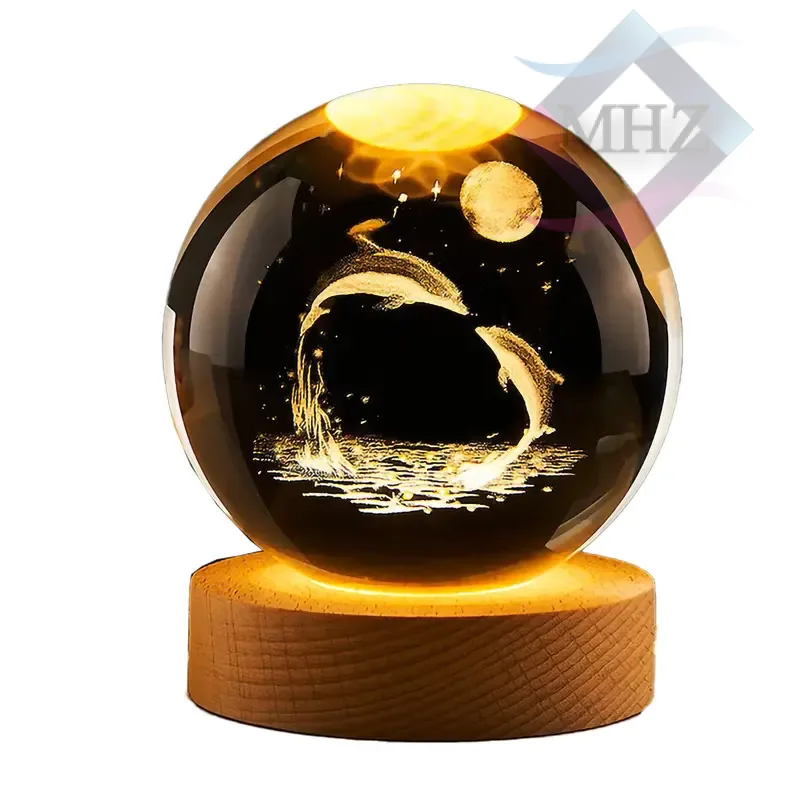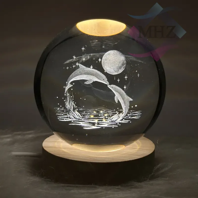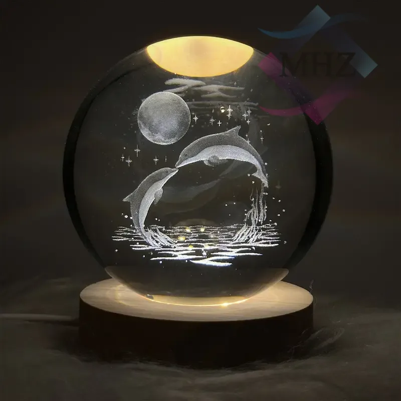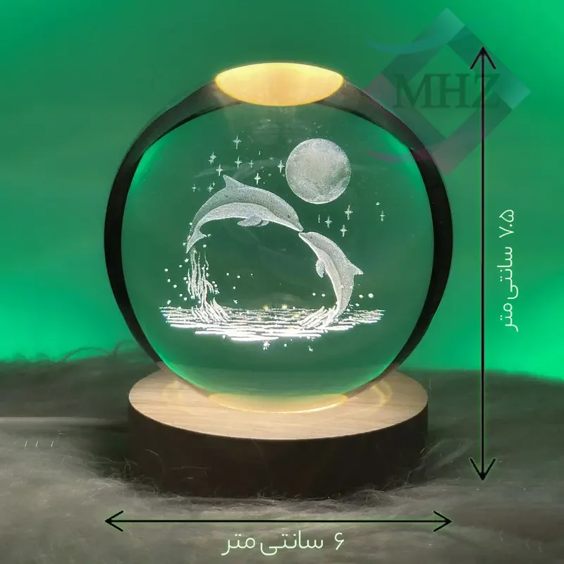 درون این گوی کریستالی، طرح برجسته دلفینهایی که بهسوی ماه در حال پرش هستند، با دقت بالایی حکاکی شده است. نورپردازی داخلی باعث میشود این طرح سهبعدی با درخشش خاصی نمایان شود.