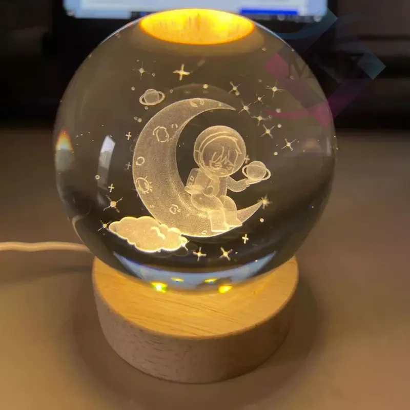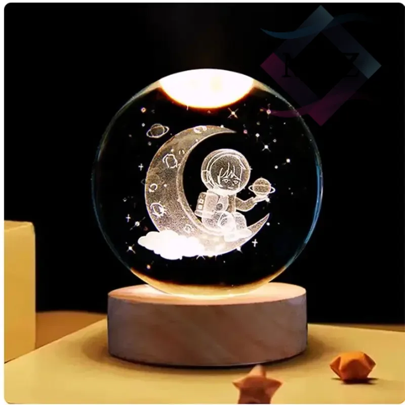 این گوی چراغ دار از جنس شیشه کریستال با کیفیت ساخته شده و در داخل آن طرحی از فضانورد و ماه به صورت سه بعدی حکاکی شده است. پایه این چراغ خواب از جنس چوب ساخته میشود و دارای لامپ LED است که نور را از پایین به داخل گوی میتاباند و طرح داخل آن را روشن میکند.